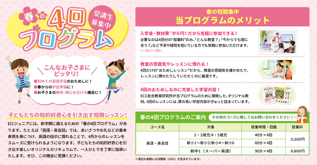 春からの入学をご検討の保護者様や、入学はしないけれど教室の雰囲気を確認したい方など、教材費不要のお得な4回プログラムを、是非この機会にお試しください!